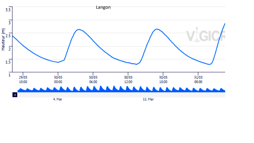 La marée haute arrive à Langon avec, environ, 1h de retard.